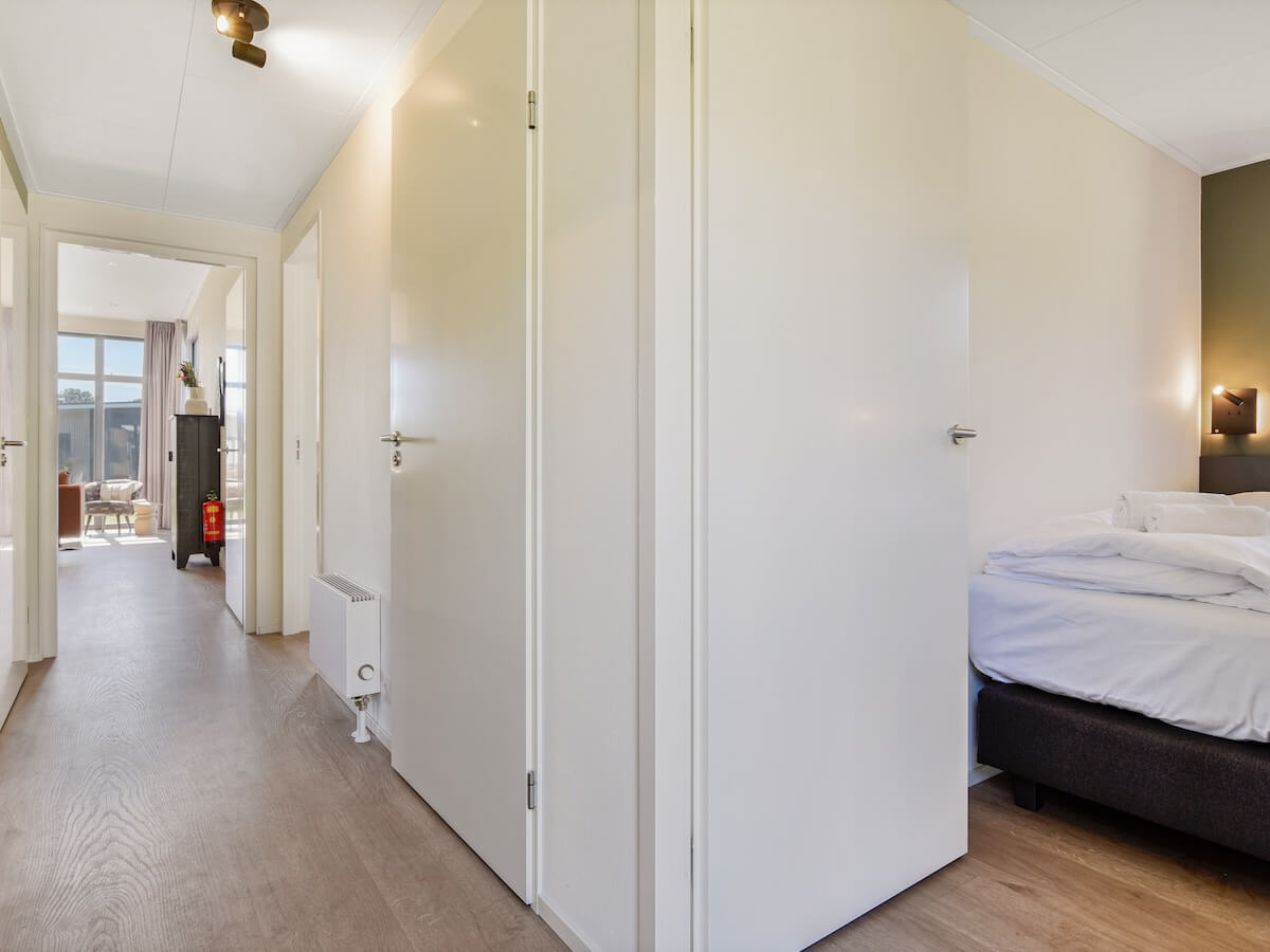 De slaapkamer aan de achterzijde heeft een schuifpui aan het terras zodat u de stralen van de ochtendzon naar binnen kunt laten vallen.