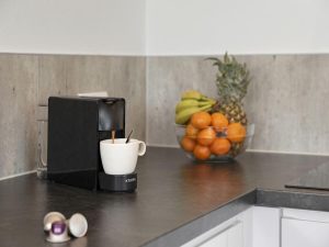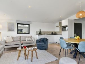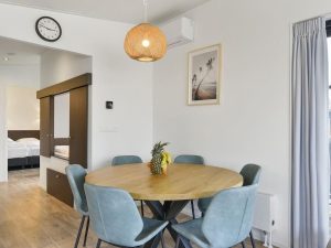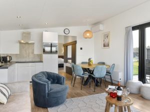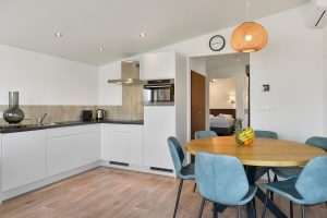 De keuken is geplaatst in hoekopstelling en is voorzien van moderne inbouwapparatuur, zoals een koelkast, combi-magnetron, inductiekookplaat en vaatwasser. Gasloos, snel en efficiënt koken dus! Daarnaast is de vakantiewoning voorzien van airconditioning. Hierdoor geniet u altijd van de perfecte temperatuur in de woning.