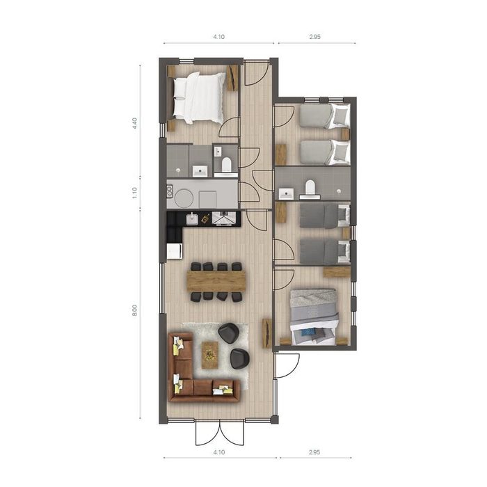 Deze 8-persoons woning heeft maar liefst vier slaapkamers. De masterbedroom is voorzien van een eigen badkamer. Via de hal bereikt u de extra badkamer, met toilet en douche, en het separate toilet. In de berging bevindt zich de aansluiting voor een wasmachine en droger. Hier is tevens het boilervat van de multisplit warmtepomp geplaatst. Ook heeft deze woning 10 stuks zonnepanelen. Duurzaamheid staat hoog in het vaandel en dit type voldoet dan ook aan de BENG-eisen en is gasloos.