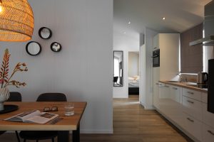 Ontworpen met raampartijen van vloer tot plafond biedt deze vakantiewoning een fijne, lichte living met een gezellige eethoek. De speelse indeling is ook te danken aan het puntvormige dak, dat tevens bijdraagt aan de moderne uitstraling van deze woning.
