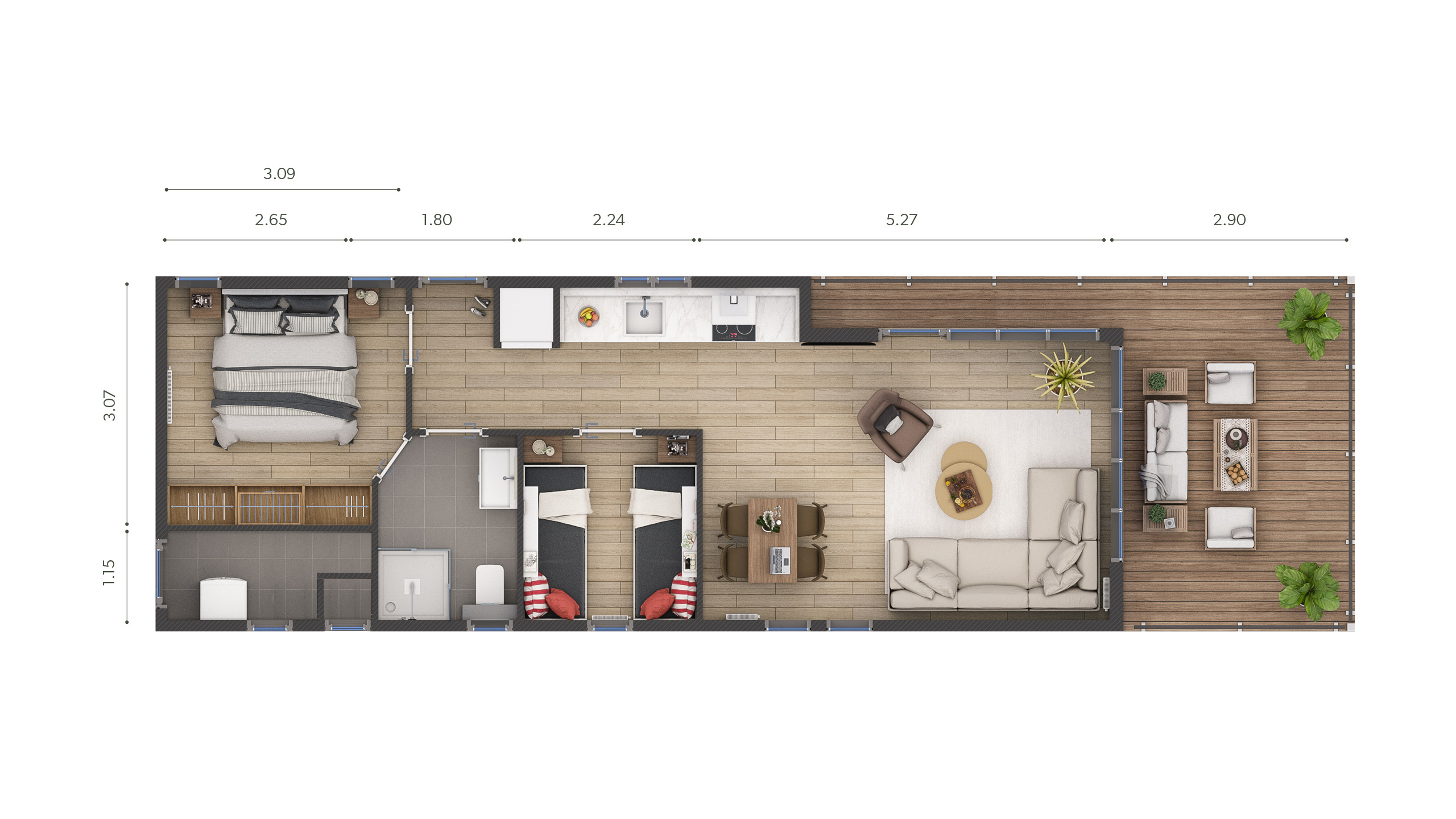 Type Strandplevier is modern, gasloos en duurzaam gebouwd. De vakantiewoning is ingedeeld in 2 slaapkamers, een badkamer met douchecabine, wastafelmeubel en toilet. De masterbedroom is voorzien van een grote inbouwkast.