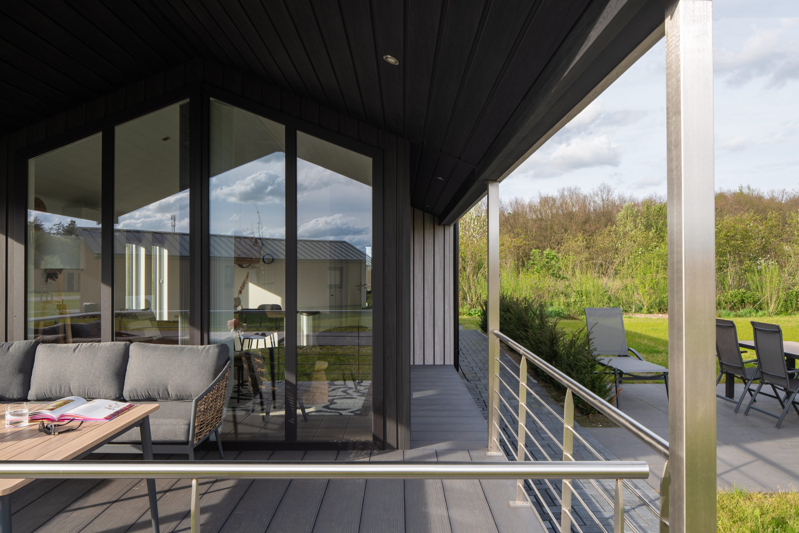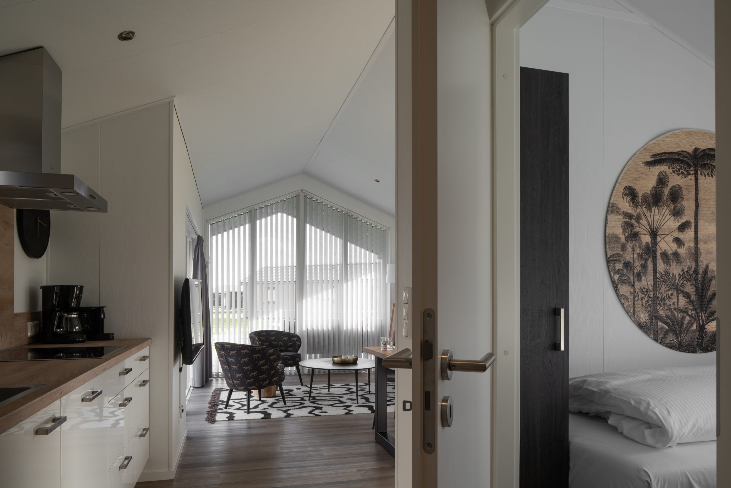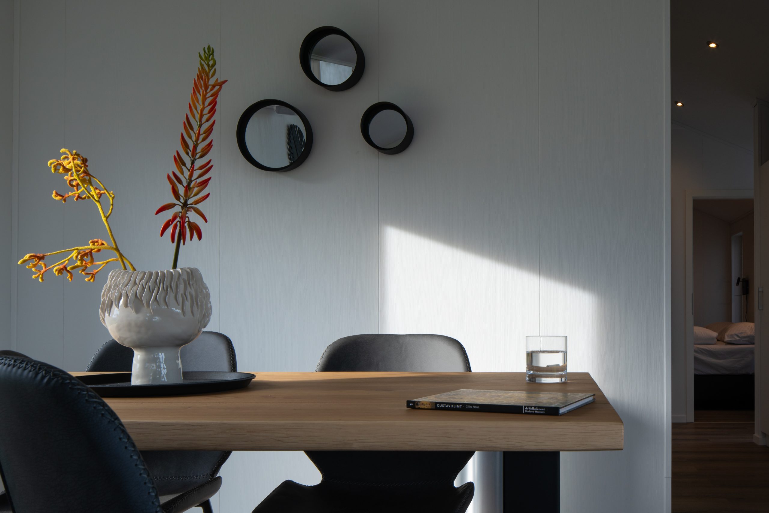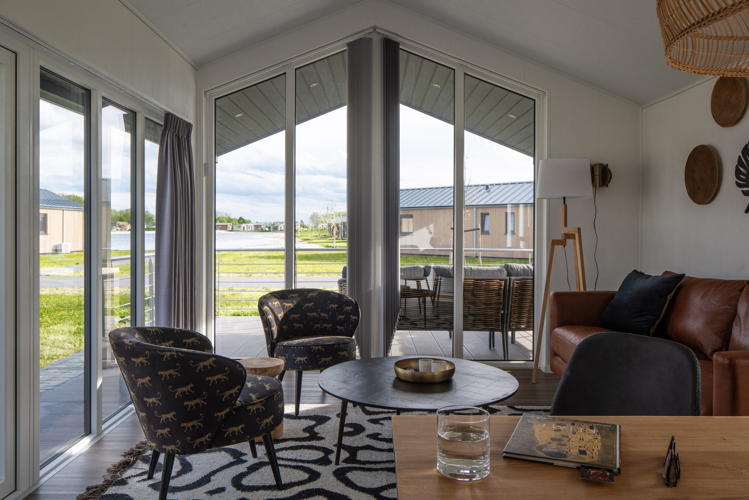 Ontworpen met raampartijen van vloer tot plafond biedt deze vakantiewoning een fijne, lichte living met een gezellige eethoek. De speelse indeling is ook te danken aan het puntvormige dak, dat tevens bijdraagt aan de moderne uitstraling van deze woning.