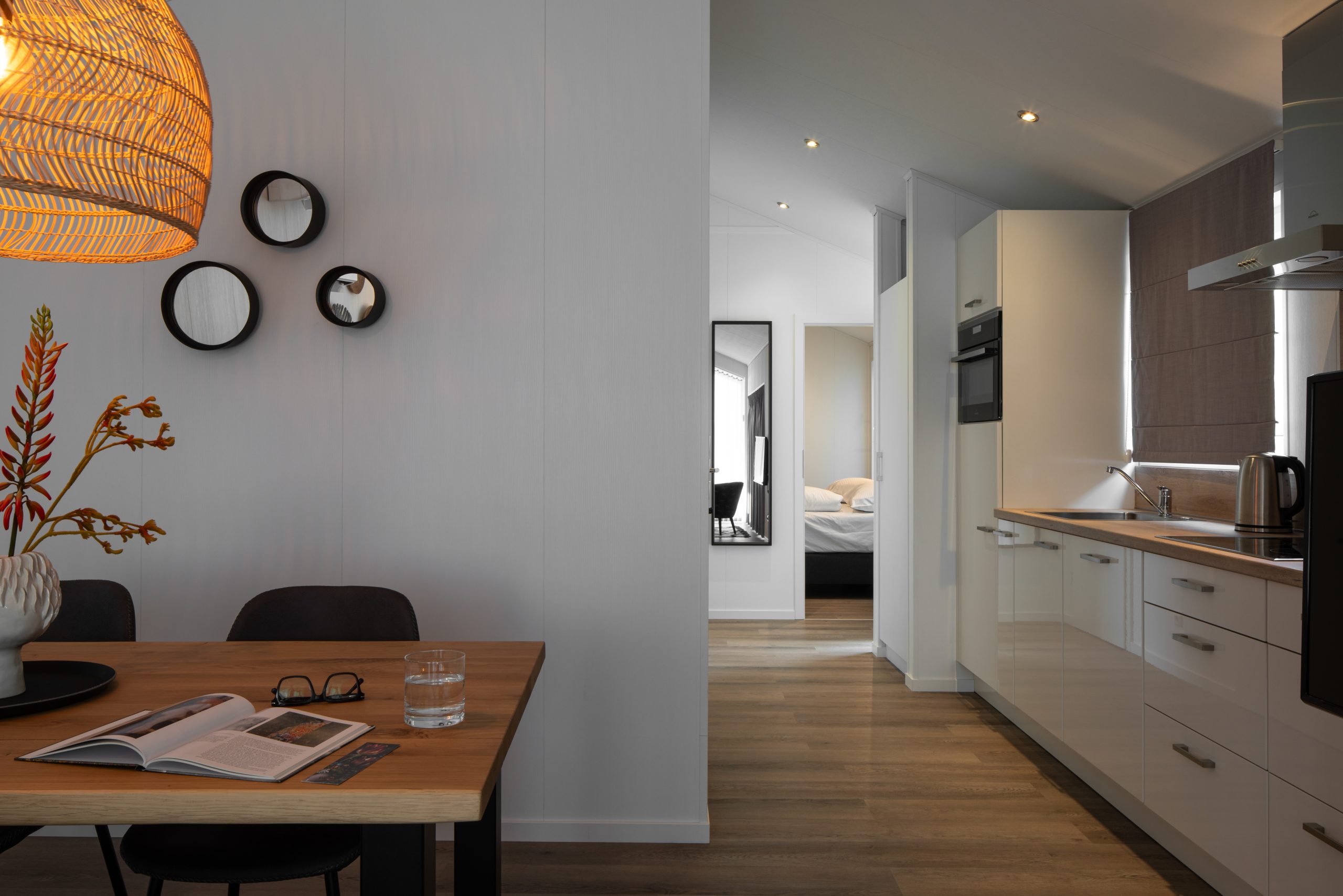 De open keuken is gesitueerd naast de living. Dit maakt dat er tijdens het koken altijd prettig contact is met de aanwezigen in het zitgedeelte. De keuken is voorzien van een combi-magnetron, inductiekookplaat, koelkast en vaatwasser. Daarnaast is de vakantiewoning voorzien van airconditioning. Hierdoor geniet u altijd van de perfecte temperatuur in de woning.