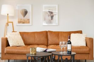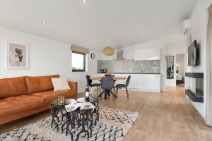 De living wordt, indien u daarvoor kiest, gezellig ingericht met een prachtig interieurpakket. Meubels en accessoires zijn zorgvuldig bij elkaar uitgezocht en sluiten perfect aan bij de sfeer van de omgeving. De eenvoudig bedienbare elektrische haard (standaard geplaatst) zorgt indien gewenst voor nog meer warmte en gezelligheid.