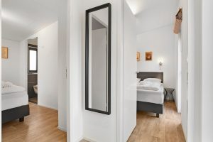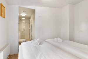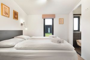 Bij het type Watersnip biedt de entreehal toegang tot de twee slaapkamers, ieder met eigen badkamer en voorzien van douche, toilet en wastafel. De berging is van buitenaf toegankelijk en biedt ruimte aan een was-droogcombinatie en enkele fietsen of tuinmeubilair. Hier is tevens de binnenunit van de luchtwarmtepomp geplaatst. Deze woning is voorzien van moderne technieken, is duurzaam en gasloos.