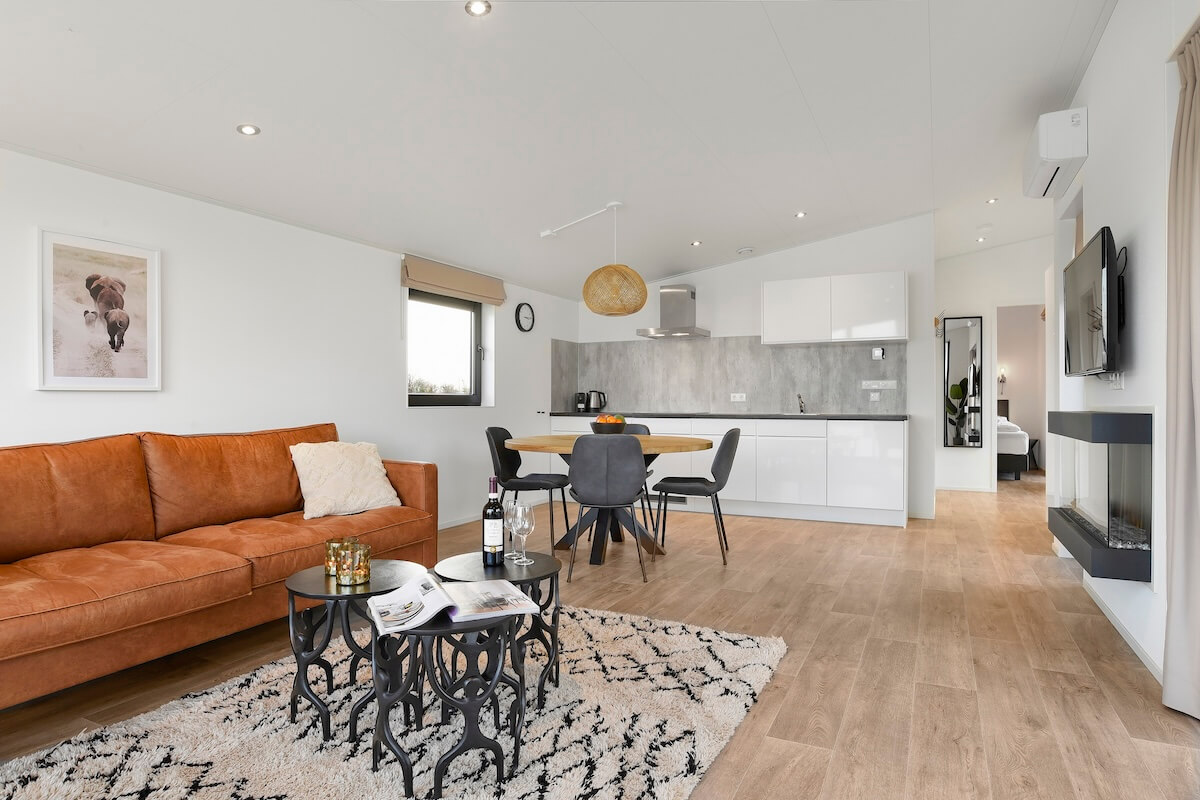 De living wordt, indien u daarvoor kiest, gezellig ingericht met een prachtig interieurpakket. Meubels en accessoires zijn zorgvuldig bij elkaar uitgezocht en sluiten perfect aan bij de sfeer van de omgeving. De eenvoudig bedienbare elektrische haard (standaard geplaatst) zorgt indien gewenst voor nog meer warmte en gezelligheid.