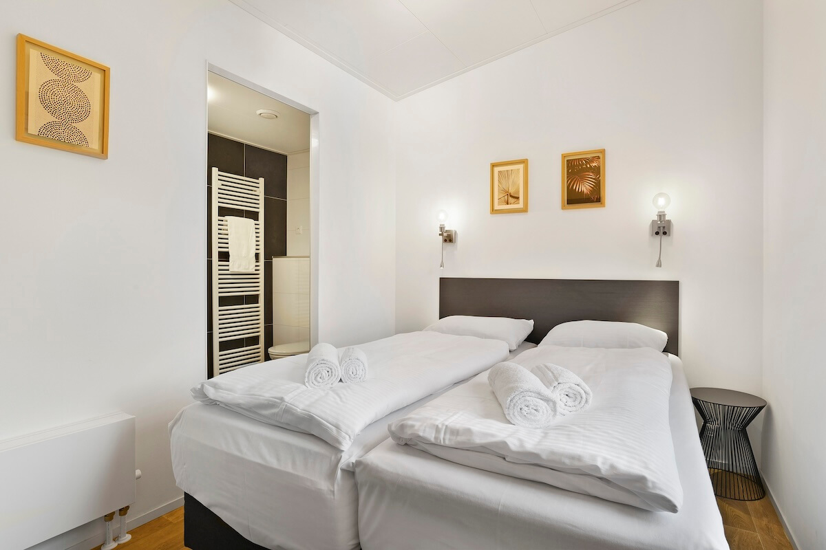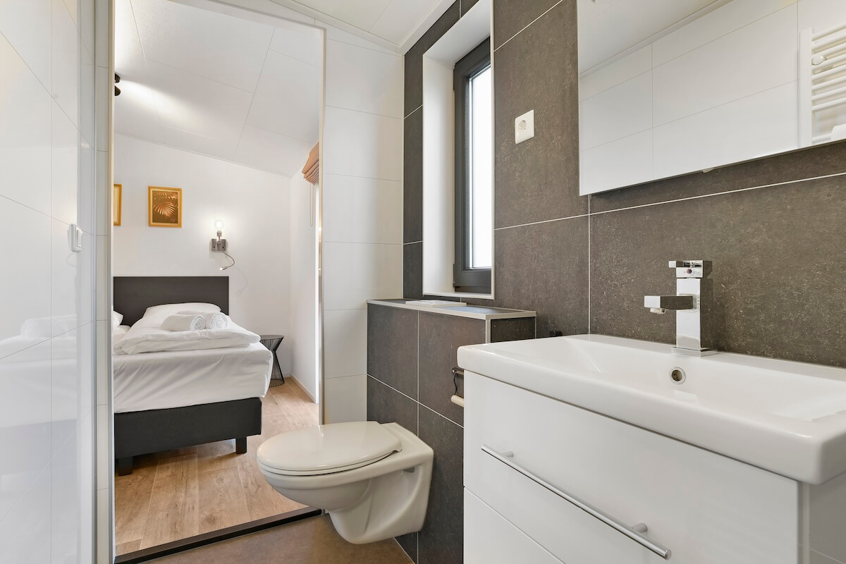 Bij het type Watersnip biedt de entreehal toegang tot de twee slaapkamers, ieder met eigen badkamer en voorzien van douche, toilet en wastafel. De berging is van buitenaf toegankelijk en biedt ruimte aan een was-droogcombinatie en enkele fietsen of tuinmeubilair. Hier is tevens de binnenunit van de luchtwarmtepomp geplaatst. Deze woning is voorzien van moderne technieken, is duurzaam en gasloos.